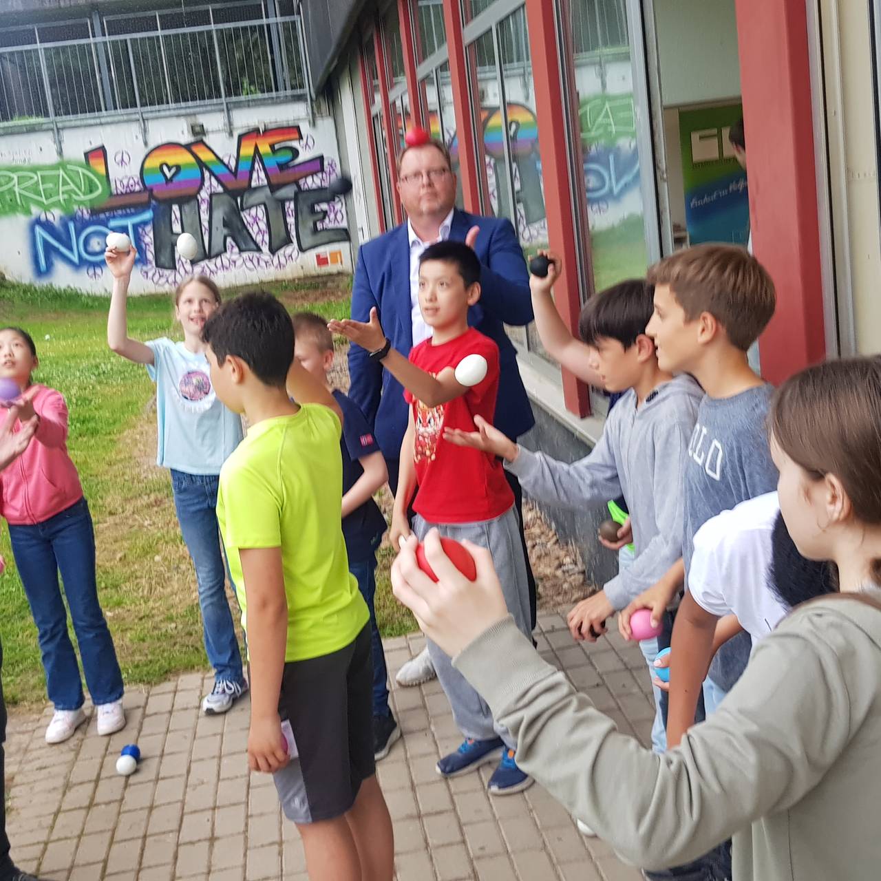 Damit der Weltrekordversuch gelingt und die Schule einen Eintrag ins Guiness Buch der Rekorde bekommt, müssen am 04.07.2024 (im Rahmen des Schulfestes zum 50-jährigen Bestehen) innerhalb von einer halben Stunde mindestens 446 Teilnehmer das Jonglieren mit 3 Bällen erlernt haben. Dazu hat die Schule Jonglier-Trainer Stephan Ehlers eingeladen. Der hat ein spezielles Trainingsprogramm parat, mit dem das klappen soll.