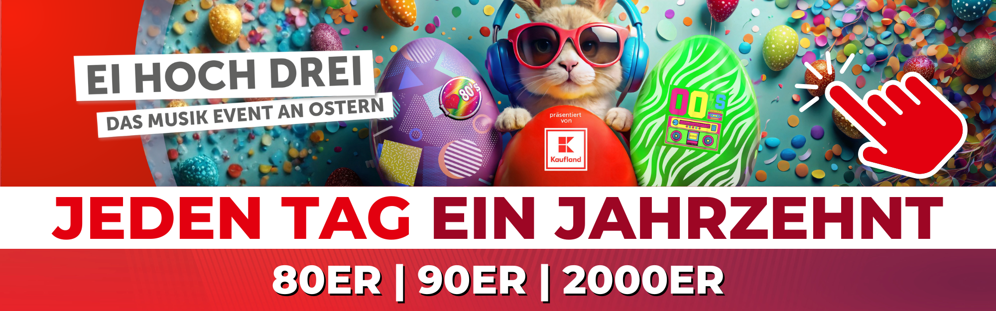 Aktionen | Ostern wird in diesem Jahr musikalisch besonders: Gemeinsam mit Kaufland gibt es bei „Ei hoch 3“ drei Tage lang die größten Hits aus drei Jahrzehnten. Von Karsamstag bis Ostermontag steht jeder Tag ganz im Zeichen einer eigenen Musikwelt.