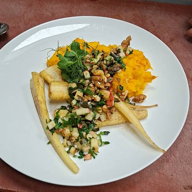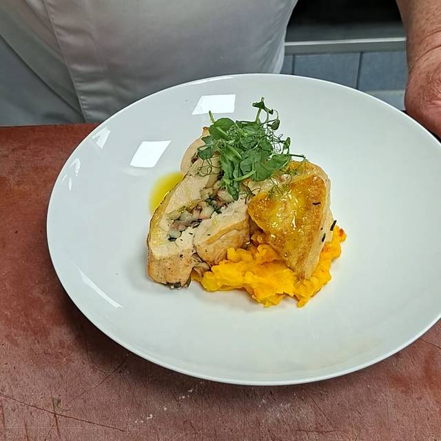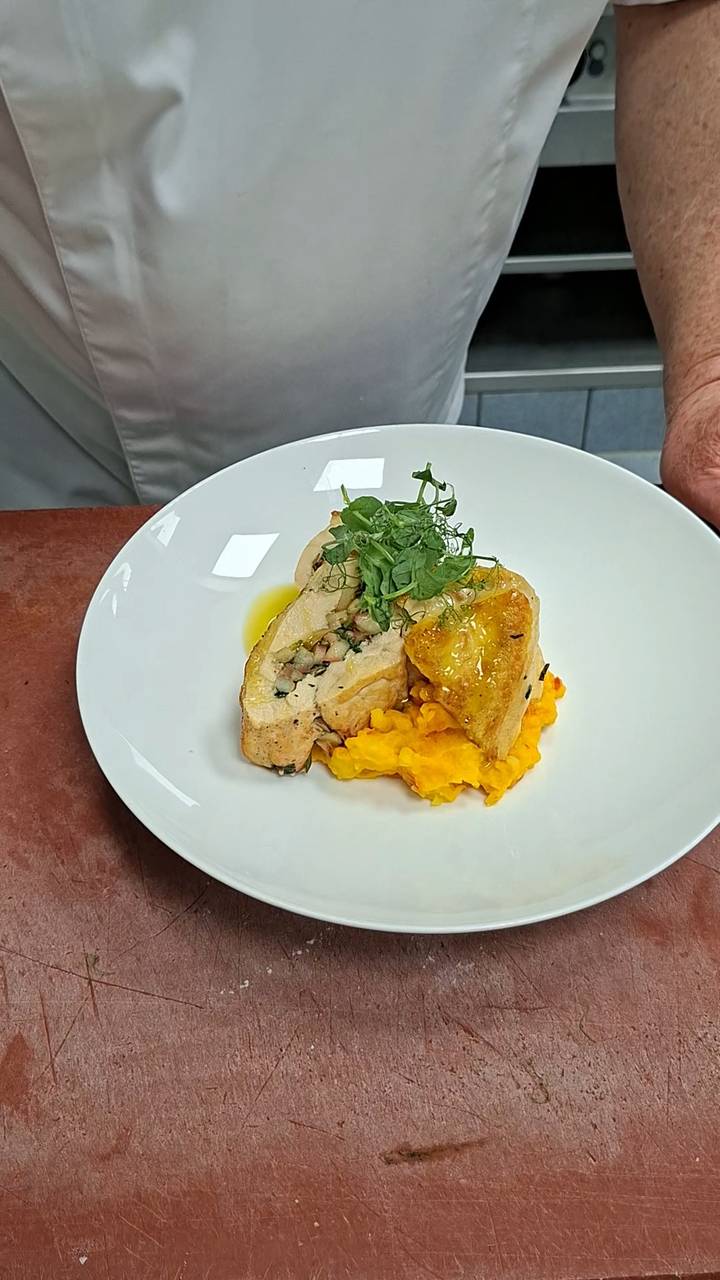 "Maispoulardenbrust auf Kürbis-Kartoffelstampf mit Äpfeln und Walnüssen"