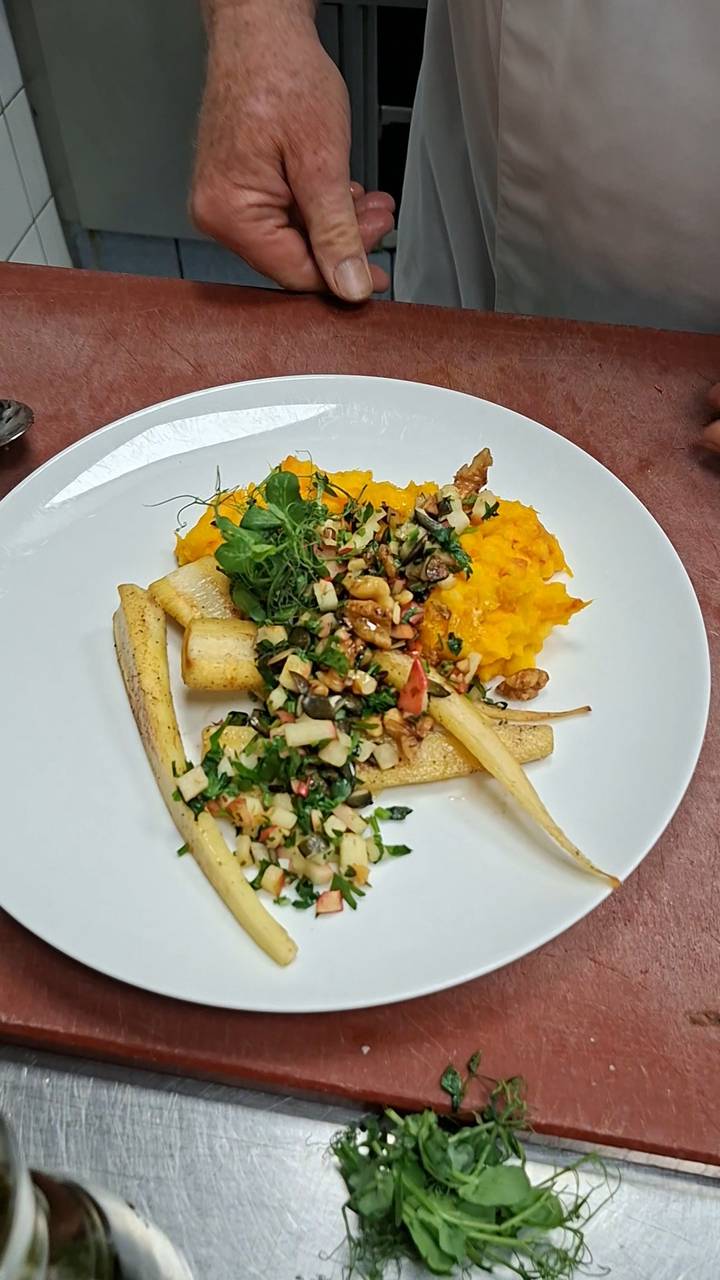 Mit dem Stampf und den Äpfel wie im oberen Rezept verfahren, zusammen mit den Pastinaken anrichten.