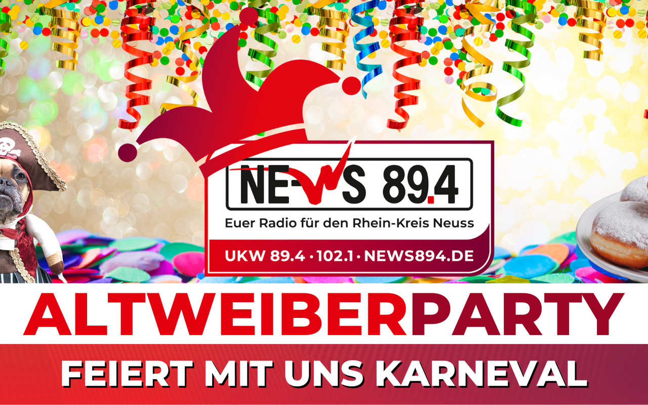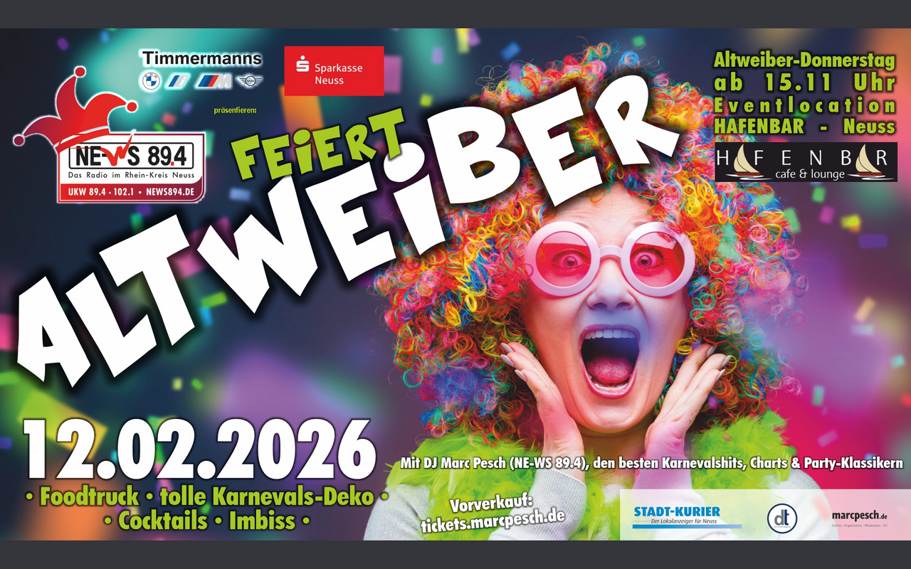 Am Donnerstag, den 12. Februar 2026, geht es in die heiße Phase des Straßenkarnevals. Da darf die legendäre NE-WS 89.4-Altweiber natürlich nicht fehlen. Ihr könnt wieder mit uns in der "Hafenbar" (Batteriestraße 7, 41460 Neuss) feiern.
