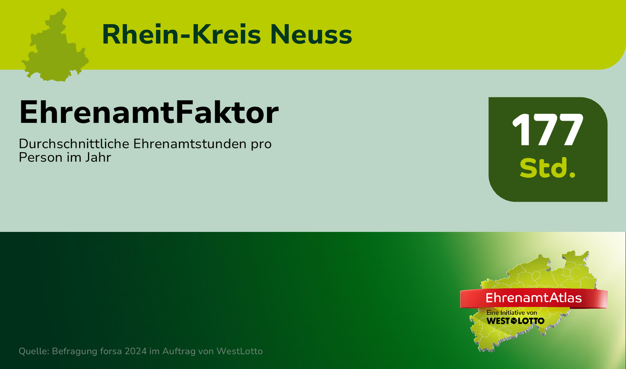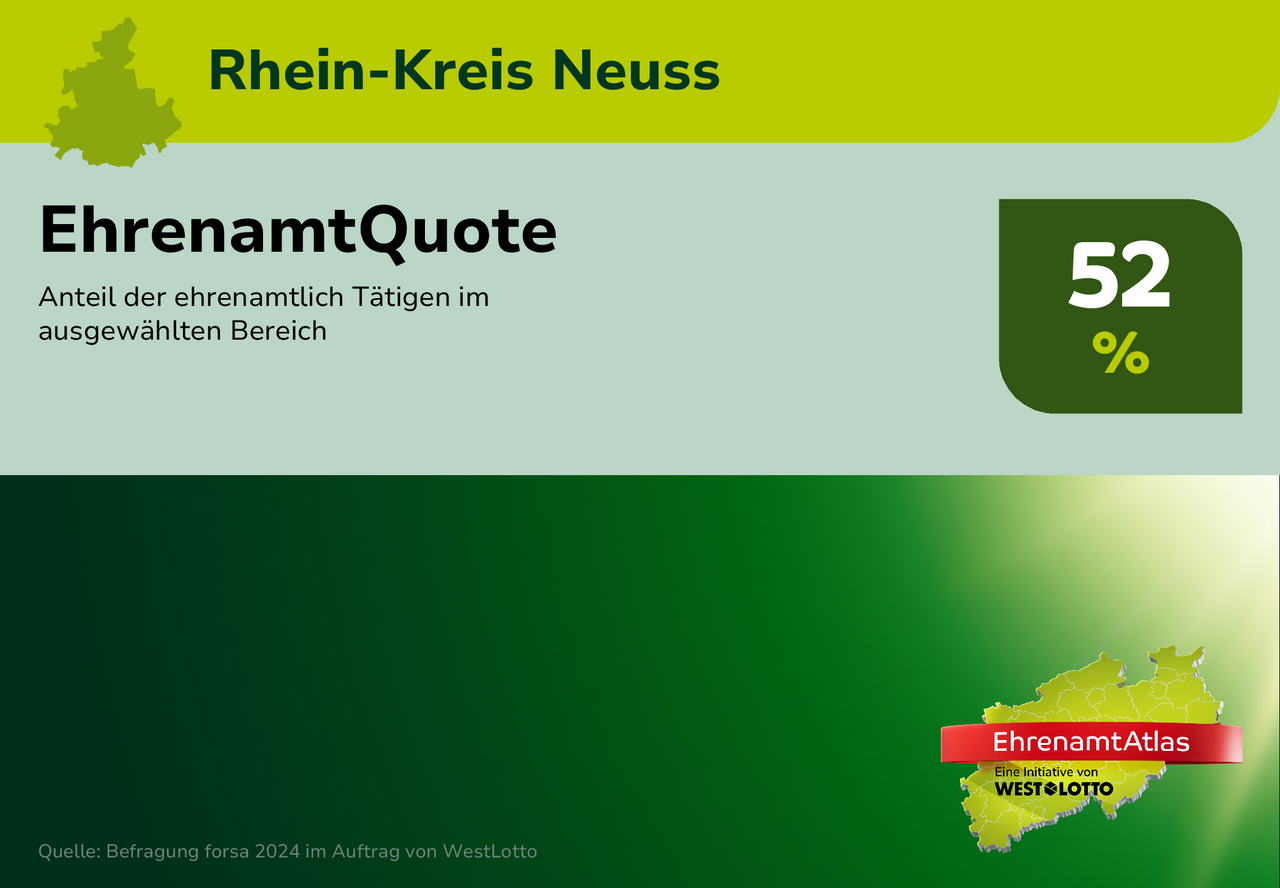 Der Atlas wurde jetzt gemeinsam von Westlotto mit dem Forschungsunternehmen forsa veröffentlicht. Demnach gehen rund 52 Prozent einer ehrenamtlichen Tätigkeit im Rhein-Kreis Neuss nach. Sie stecken im Schnitt bis zu vier Stunden Arbeit die Woche hinein. Die meisten arbeiten in den Bereichen "Sport und Bewegung" und "Religion und Kirche". Dabei arbeiten Männer meist in den sportlichen Bereichen; Frauen eher im Seelsorgebereich. Die Tendenz ist in unserem Kreis allerdings im Vergleich zum Vorjahr leicht gesunken.