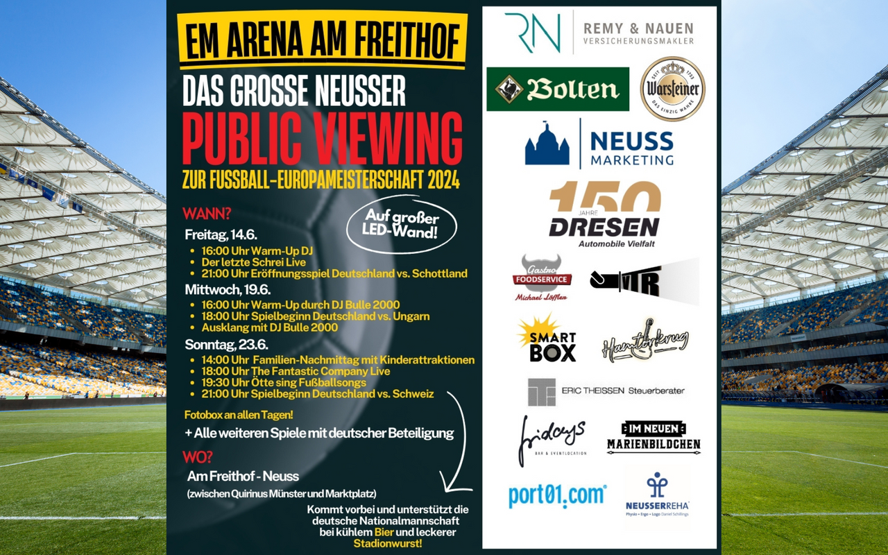 Der Freithof in Neuss wird zu einer „EM-Arena“. Dort wird es Public Viewing für bis zu 750 Zuschauern auf dem Freithof vor dem Neusser Zeughaus geben. Zu allen deutschen Spielen gibt es - neben der Spielübertragung auf Großbildleinwand - auch ein Rahmenprogramm mit z.B. DJs vor & teilweise nach den Spielen. Beim Spiel am 23.06. ist außerdem einen Familien-Nachmittag mit Hüpfburg, Torwandschießen und Kinder-Schminken geplant.