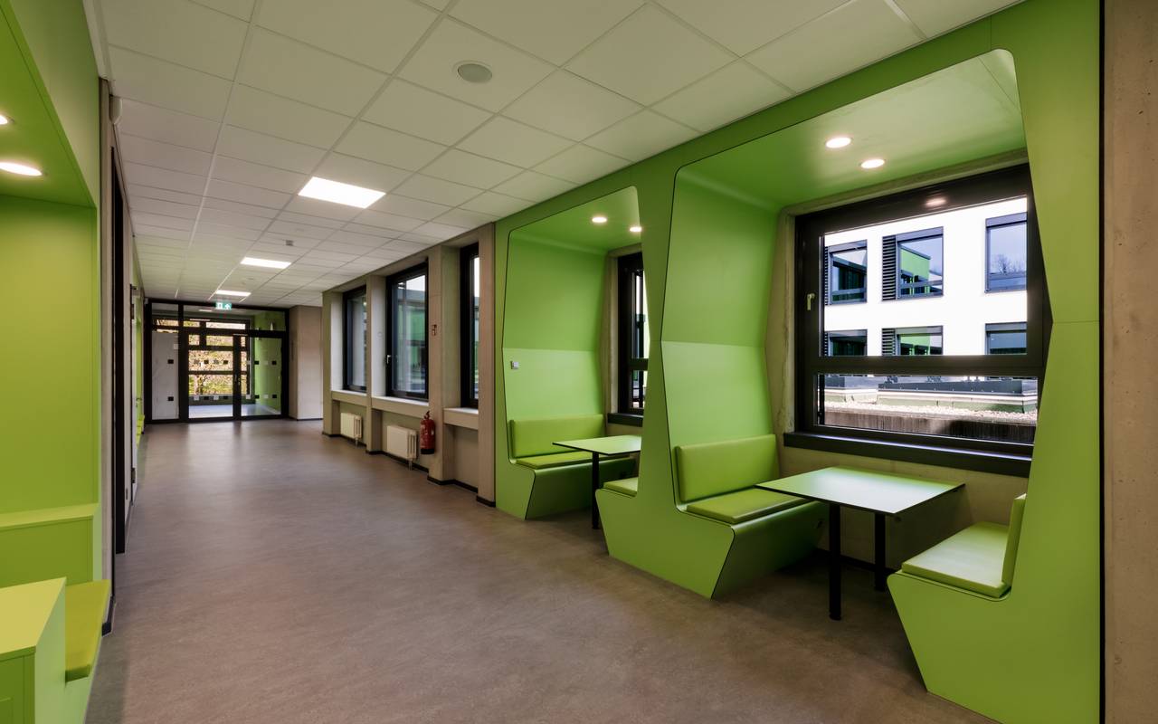 Die Schule hat einen dreigeschossigen Erweiterungsbau bekommen. Das Herzstück sei die Mensa mit 500 Essensplätzen, so die Architektin. In den beiden Obergeschossen befinden sich 24 Klassenräume und sogenannte Lernkojen auf den Fluren, wo die Schüler ihre Freistunden verbringen können. Der Neubau war nötig, weil die Gesamtschule Norf größer werden sollte als die Ganztagsrealschule, die zuvor an dem Standort war.