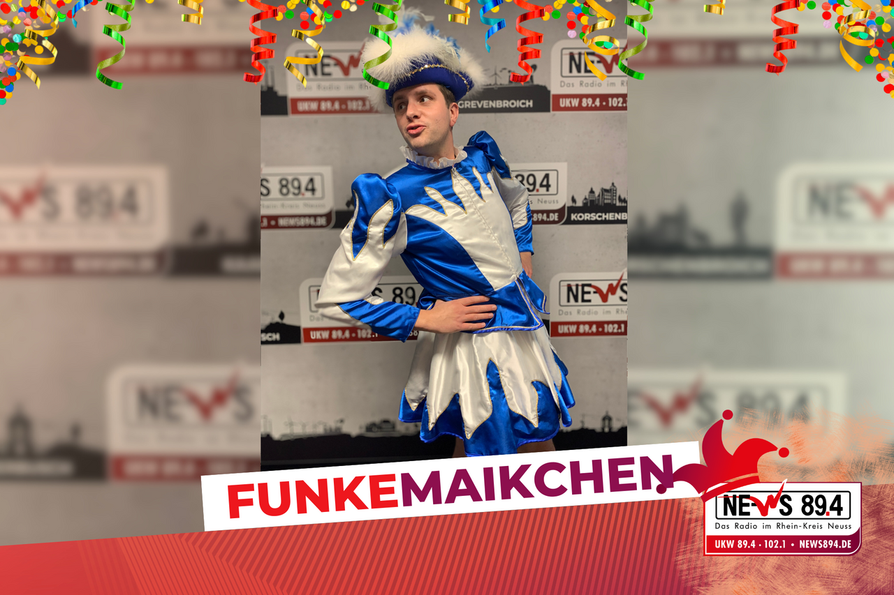 Das Funke-Maikchen ist schon ein altbekanntes Kostüm hier bei NE-WS 89.4. Maik trägt dabei ein schickes blau-weißes Kostüm, das ein wenig knapp ausfällt und seine langen Beine in den Fokus rückt. Passend dazu hat Maik einen Hut mit viel weißem Wollbausch auf.