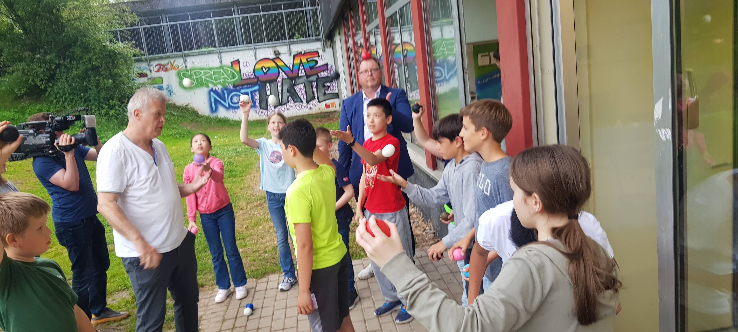 Damit der Weltrekordversuch gelingt und die Schule einen Eintrag ins Guiness Buch der Rekorde bekommt, müssen am 04.07.2024 (im Rahmen des Schulfestes zum 50-jährigen Bestehen) innerhalb von einer halben Stunde mindestens 446 Teilnehmer das Jonglieren mit 3 Bällen erlernt haben. Dazu hat die Schule Jonglier-Trainer Stephan Ehlers eingeladen. Der hat ein spezielles Trainingsprogramm parat, mit dem das klappen soll.