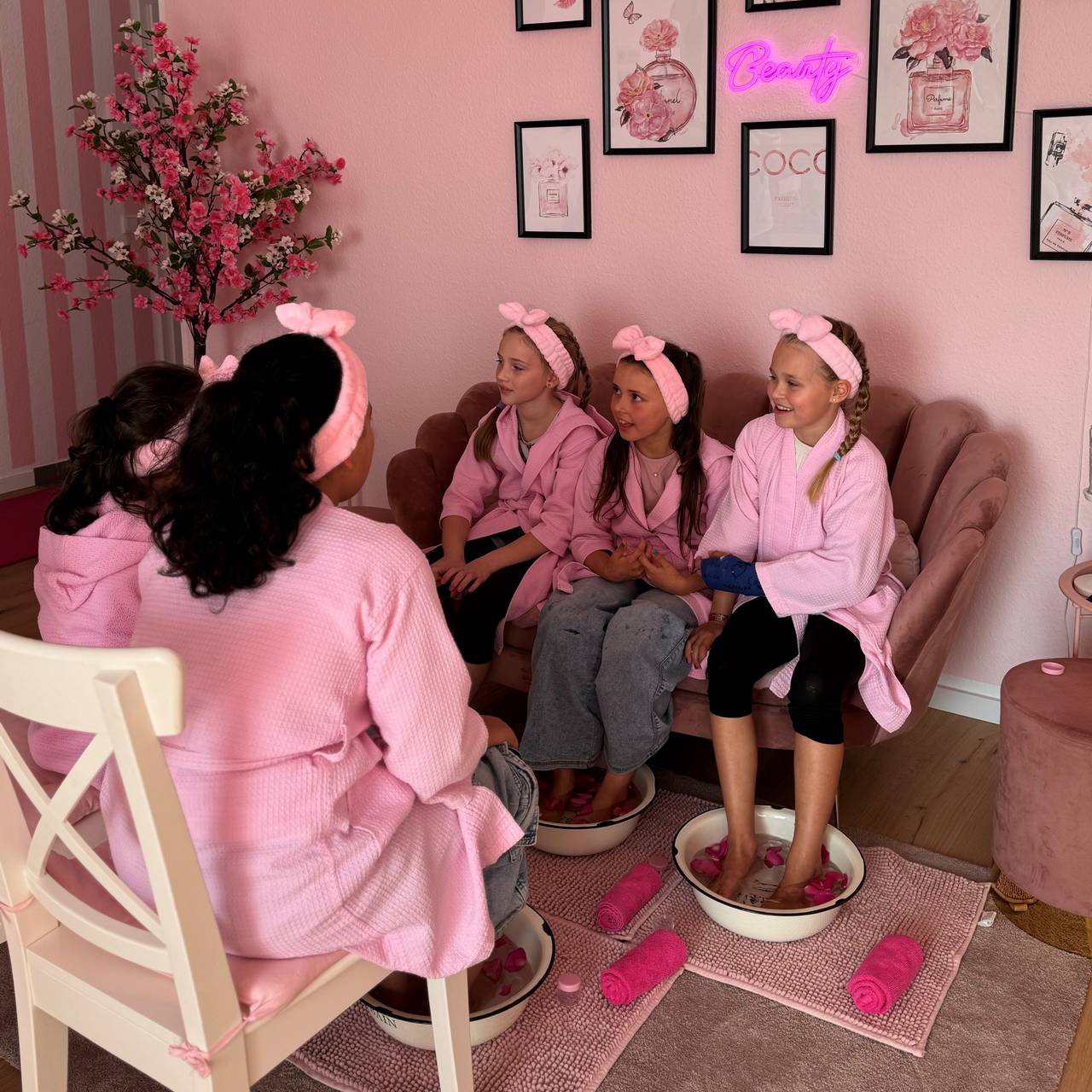 Fünf Mädchen feiern gerade einen 10. Geburtstag. Die Kosten liegen dabei für drei Stunden bei knapp 400 Euro. Es gibt allerdings unterschiedliche Angebote mit unterschiedlichen Preisstufen. Die fünf bekommen Bademäntel und Schlappen, damit sie sich besonders wohlfühlen.