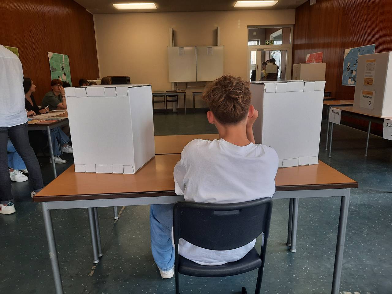 Die Janusz-Korczak-Gesamtschule in Neuss macht die Klassensprecherwahl im Bundestagsformat. Es wurden Wahlkabinen aufgebaut, in denen man ganz geheim seine Stimme abgeben darf.