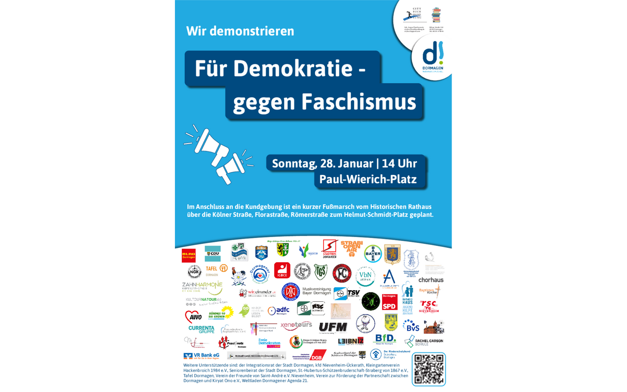 Auch die Stadt Dormagen hat unter dem Motto „Für Demokratie – gegen Faschismus“ ein Zeichen gegen Rechtsextremismus gesetzt. Beginn der Kundgebung war ebenfalls um 14 Uhr auf dem Paul-Wierich-Platz vor dem Historischen Rathaus. Im Anschluss war ein Fußmarsch zum Helmut-Schmidt-Platz geplant.