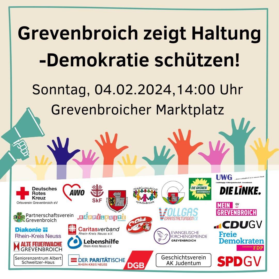 In Grevenbroich wird es am Sonntag (04.02.), eine Demo auf dem Marktplatz geben. Sie soll um 14:00 Uhr starten. Neben einer Rede von Grevenbroichs Bürgermeister Klaus Krützen werden verschiedene Bands auftreten.