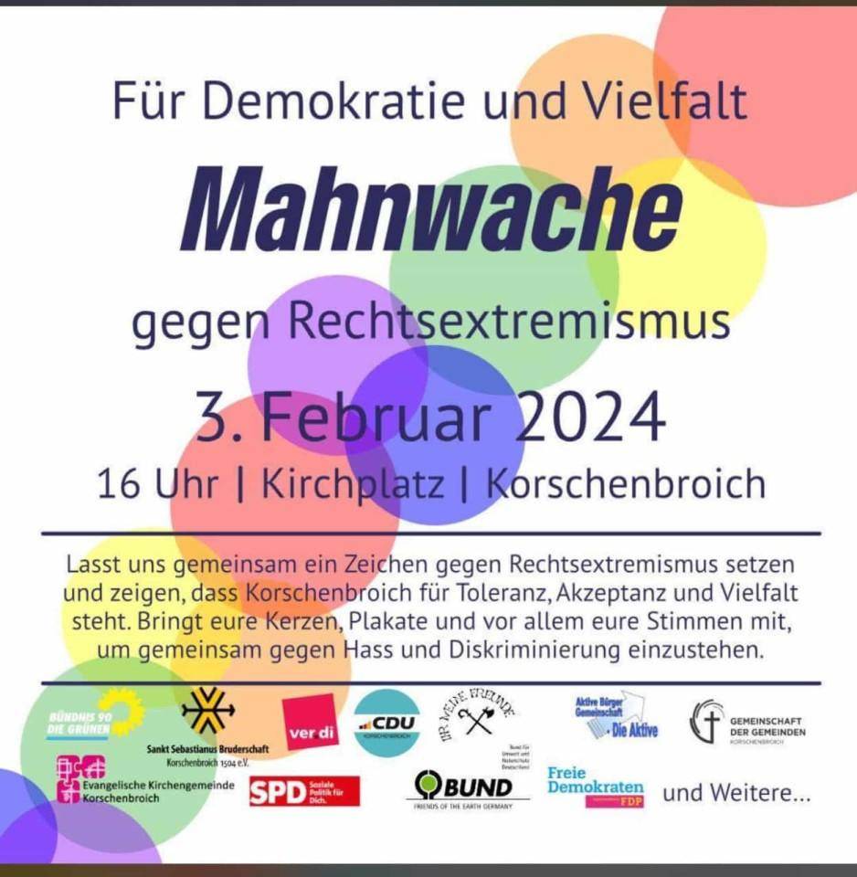 Lasst uns gemeinsam ein Zeichen gegen Rechtsextremismus setzen und zeigen, dass Korschenbroich für Toleranz, Akzeptanz und Vielfalt steht. Bringt eure Kerzen, Plakate und vor allem eure Stimme mit, um gemeinsam gegen Hass und Diskriminierung einzustehen.
