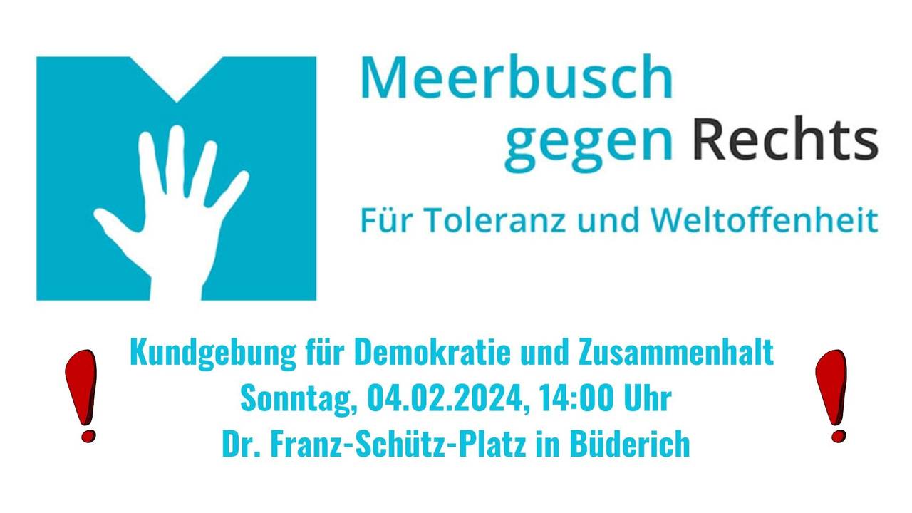 In Meerbusch ruft das Bündnis Meerbusch gegen Rechts dazu auf, am Sonntag (04.02.) auf dem Dr. Franz-Schütz-Platz zu demonstrieren. Los geht's um 14 Uhr.