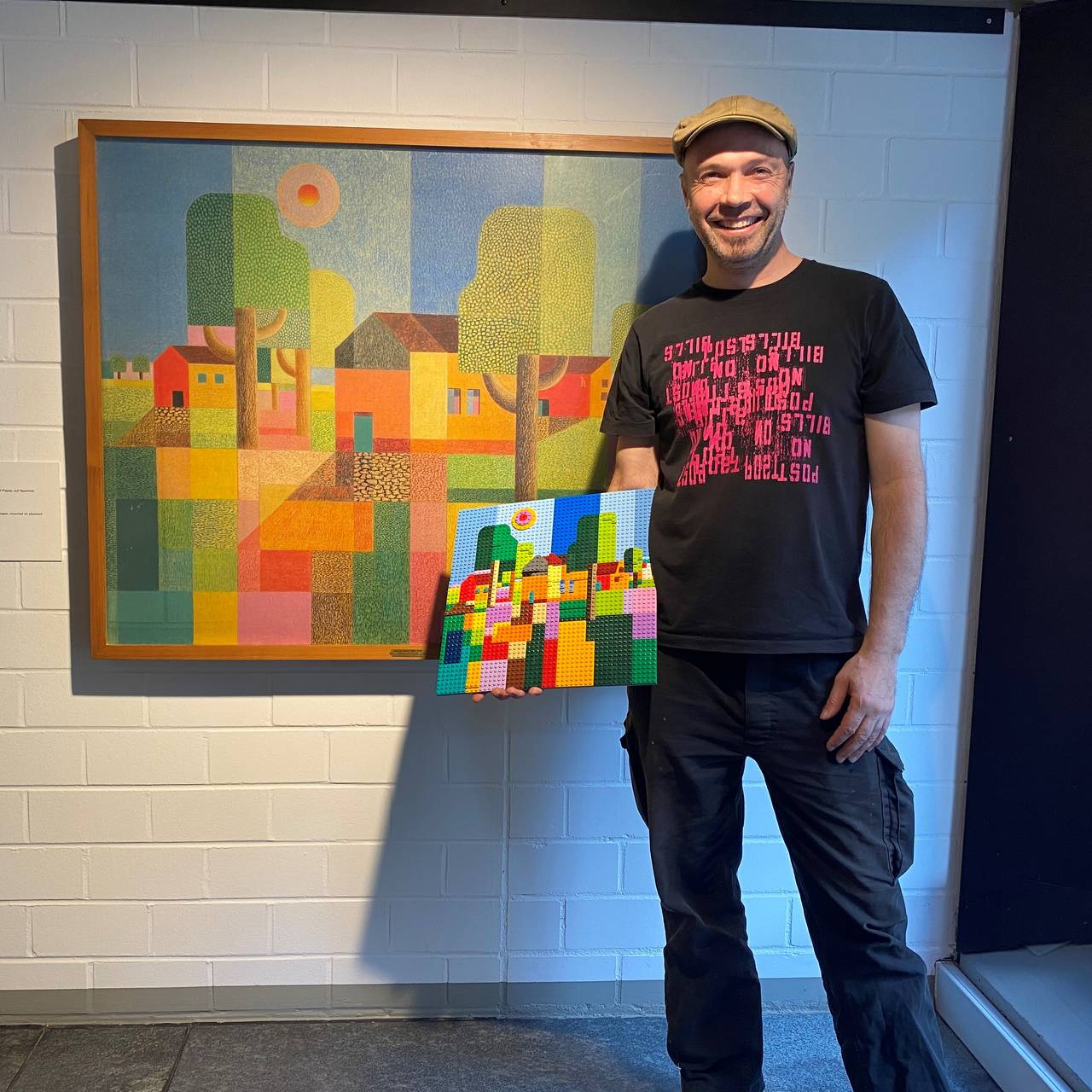 Cole Blaq baut mit den kleinen bunten Steinen Kunstwerke nach. Wie zum Beispiel die "Rheinische Landschaft" von Heinrich Hoerle.