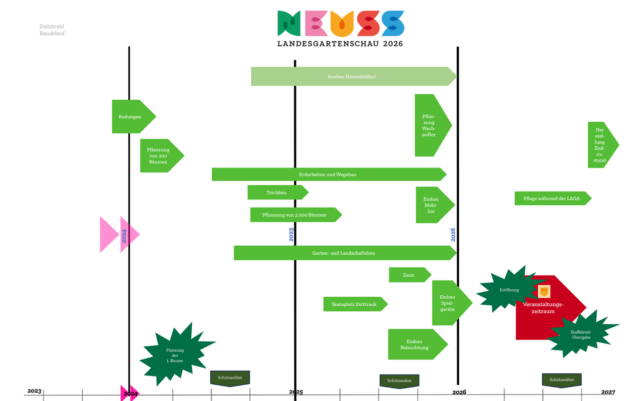 Weitere geplante Bereiche des neuen Landesgartenschau-Parks sind unter anderem: Ein Platz mit Bühne für große und kleine Veranstaltungen, zentrale Parkwiese, Wiesenpromenade, Kleinkind- und Kinderspielplätze und Sportflächen.