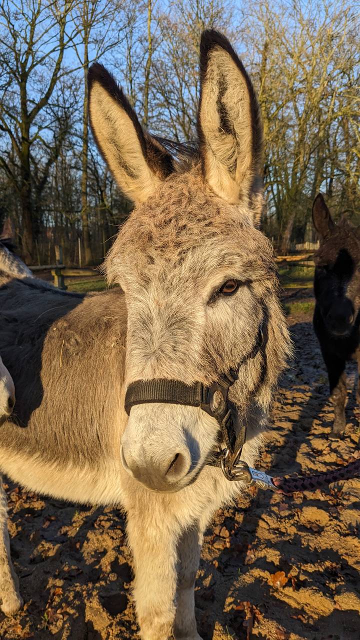Eselpfleger Rolf Baldes nimmt uns in Empfang und bringt uns zum Geburtstagskind.