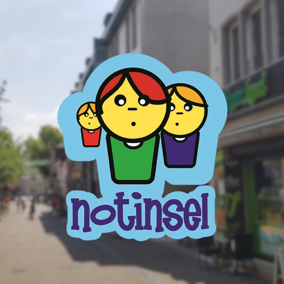 Wir waren bei der City-Buchhandlung von Jorgos Frambouraris auf der Kölner Straße in Dormagen. Direkt vorne am Eingang klebt da ein Aufkleber mit dem Schriftzug "Notinsel":