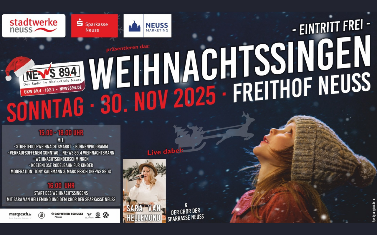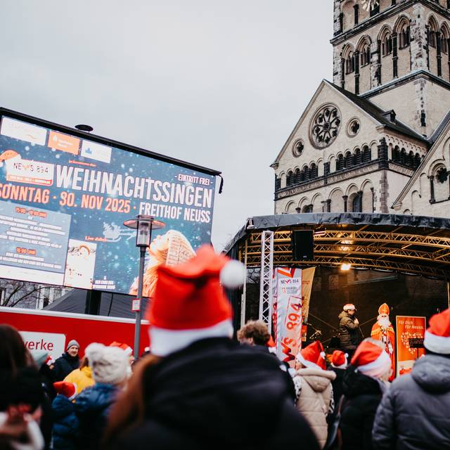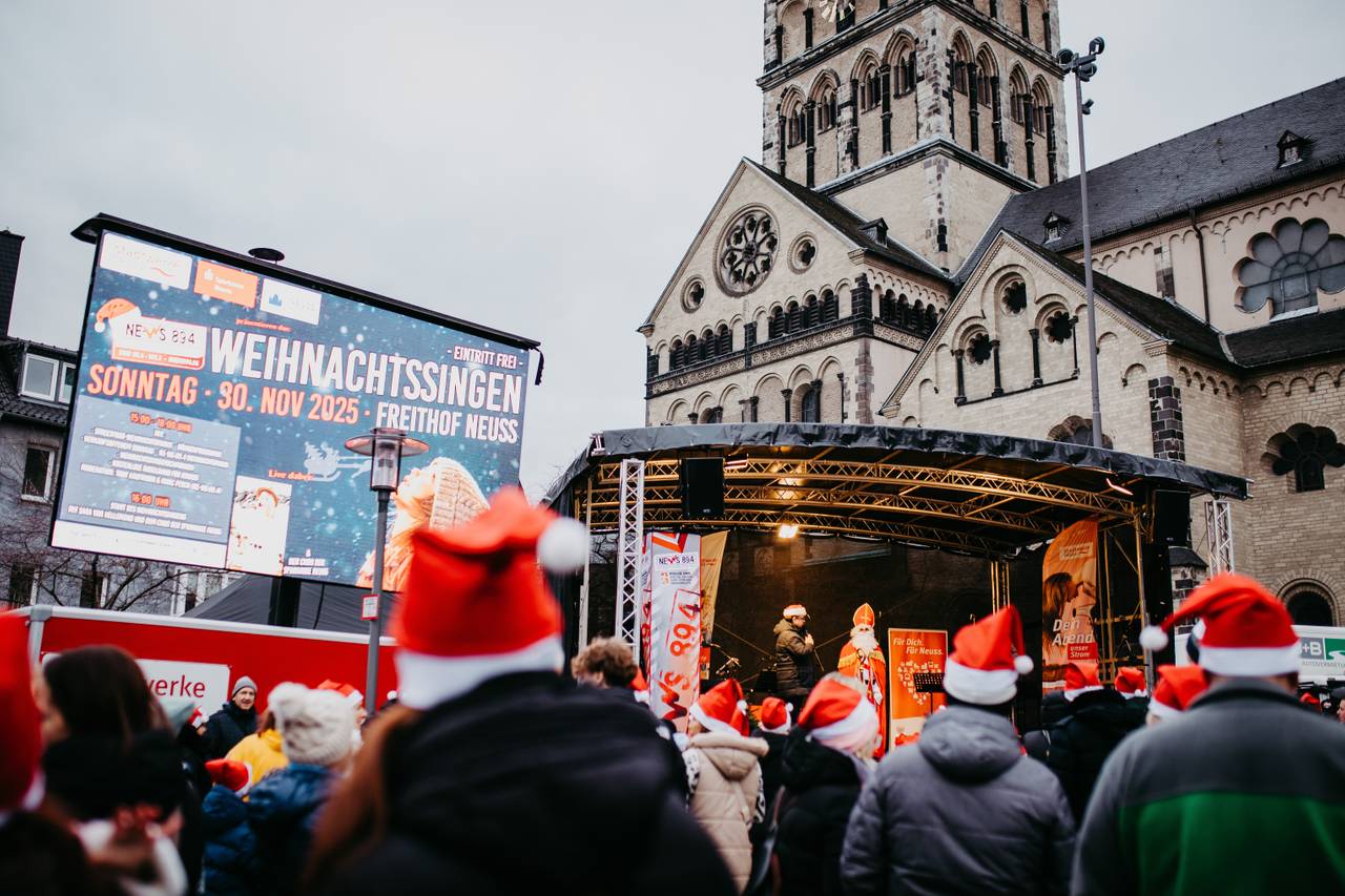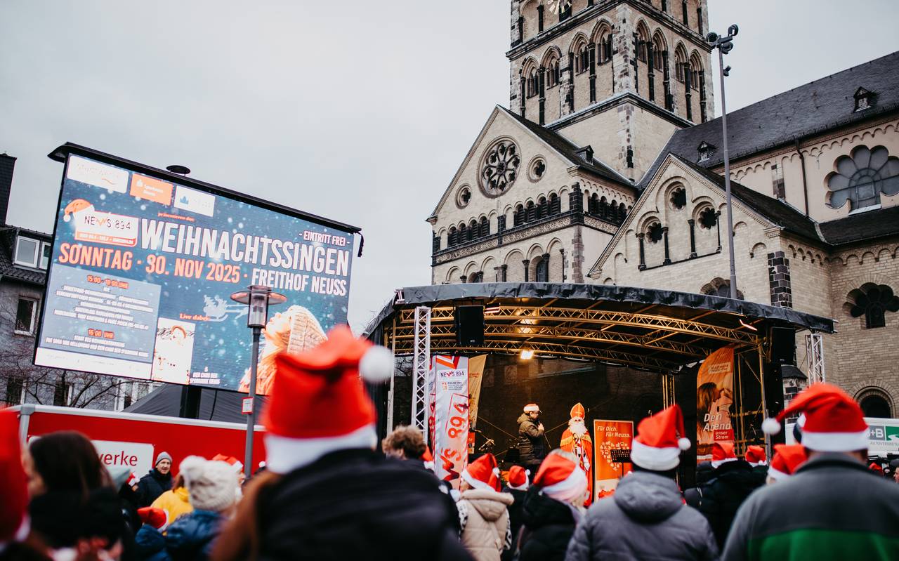 Das NE-WS 89.4-Weihnachtssingen hat traditionell am 1. Advent (30.11.25) in der Neusser Innenstadt (verkaufsoffener Sonntag) auf dem Freithof vor dem Zeughaus stattgefunden. Mit großer Bühne, Streetfood-Weihnachtsmarkt, einer Rodelbahn und Kinderschminken. Vorsängerin war erneut Sara van Hellemond, die auch vom Chor der Sparkasse Neuss unterstützt wurde. Der Eintritt war frei.