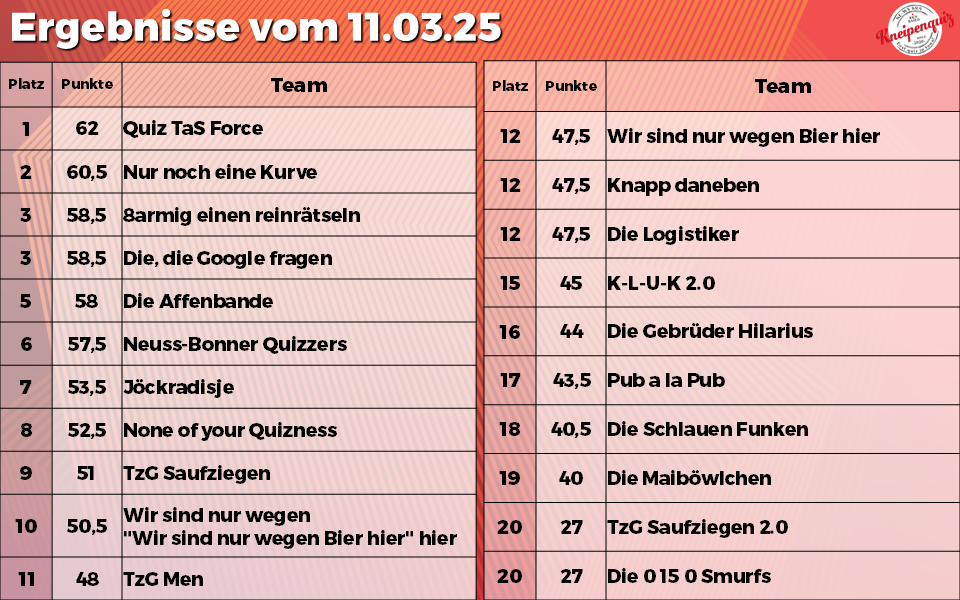 Am Ende gab es zwei Tagessieger, die unglaubliche 62 von 70 möglichen Punkten geholt haben: "Quiz TaS Force" (11.03.25) und "Thekenkrönchen" (12.03.25) waren nicht zu schlagen.