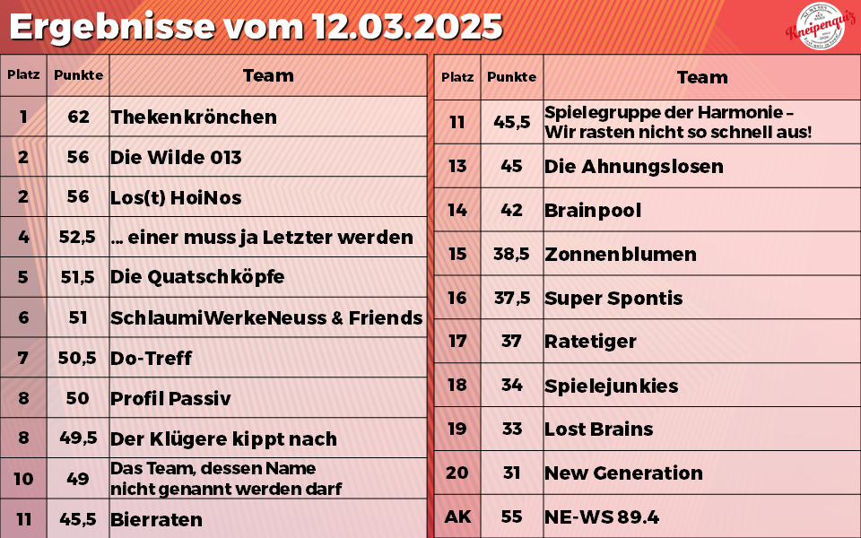 Rückblick: NE-WS 89.4-Kneipenquiz: Saison 2025 - Spieltag 1