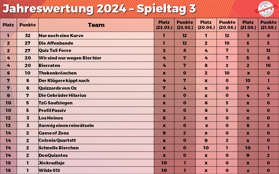 Hier findet ihr den Zwischenstand der Jahreswertung 2024. Alle Platzierungen aus einem Quizjahr fließen in die Jahreswertung ein. An jedem einzelnen Quiz-Spieltag erhält das Siegerteam 12 Punkte, die Zweitplatzierten 10, die Dritten 8 und dann runter bis Platz 10 jeweils einen Punkt weniger.