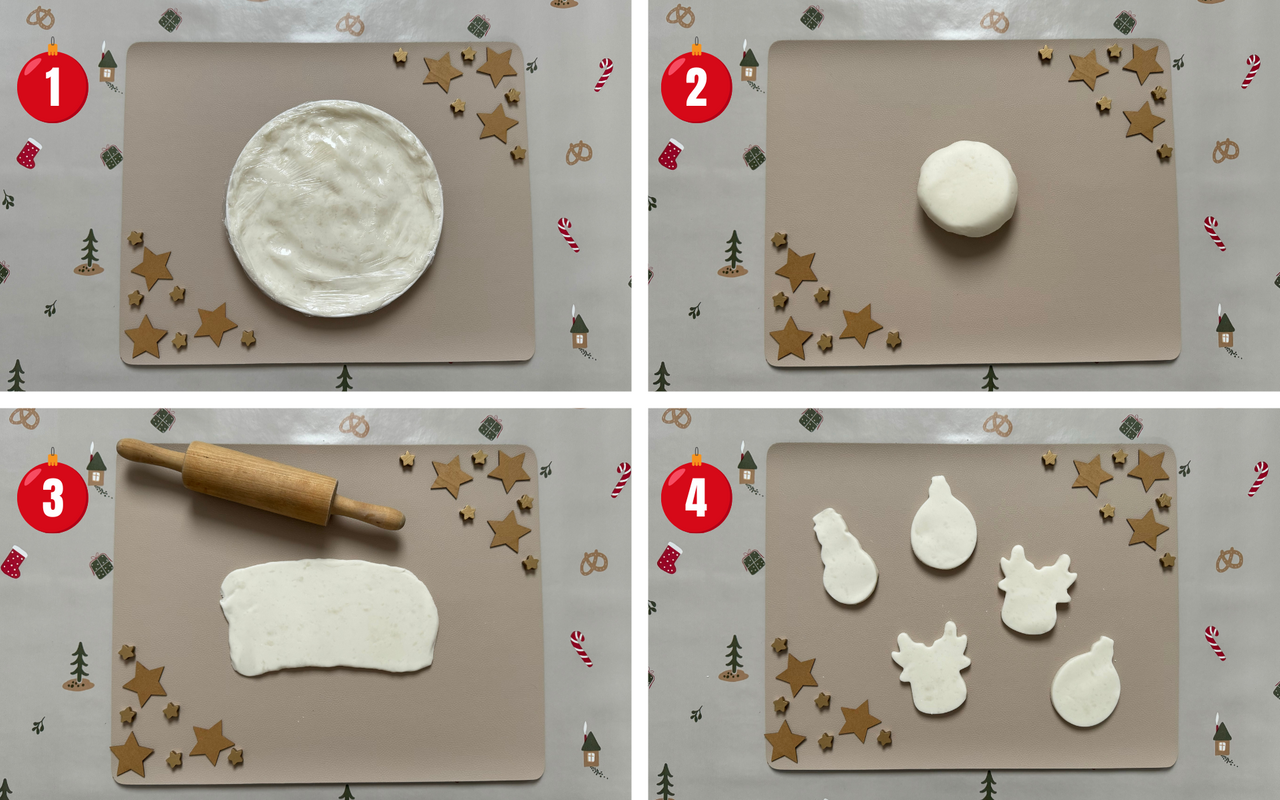 Nach 5-10 Minuten könnt ihr den Teig ausrollen und Formen ausstechen. Wer aus dem Teig Weihnachtsbaumschmuck basteln möchte, muss unbedingt an die Löcher zum Aufhängen denken. Dafür könnt ihr einfach mit einem Zahnstocher, einem Schaschlik-Spieß oder auch mit einem Stift ein Loch stechen. Setzt das Loch jedoch nicht zu nah an die Kante, damit der Teig dort während des Trocknens nicht einreißt.